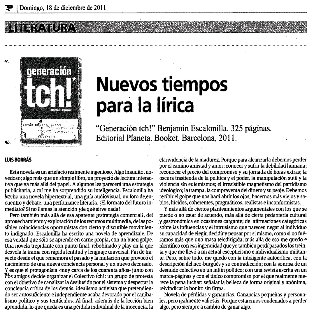 “Con Generación tch! he pretendido una novela contemporánea en fondo y forma”nov 2011